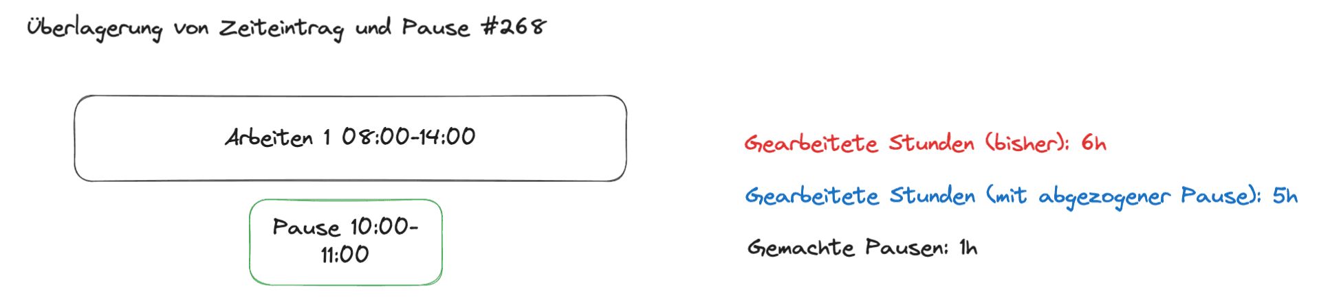 - Beispiel: Ein Arbeitszeiteintrag von 8:00 bis 16:00 Uhr sowie eine Pause von 12:00 bis 13:00 Uhr ergaben weiterhin 8 Arbeitsstunden.
