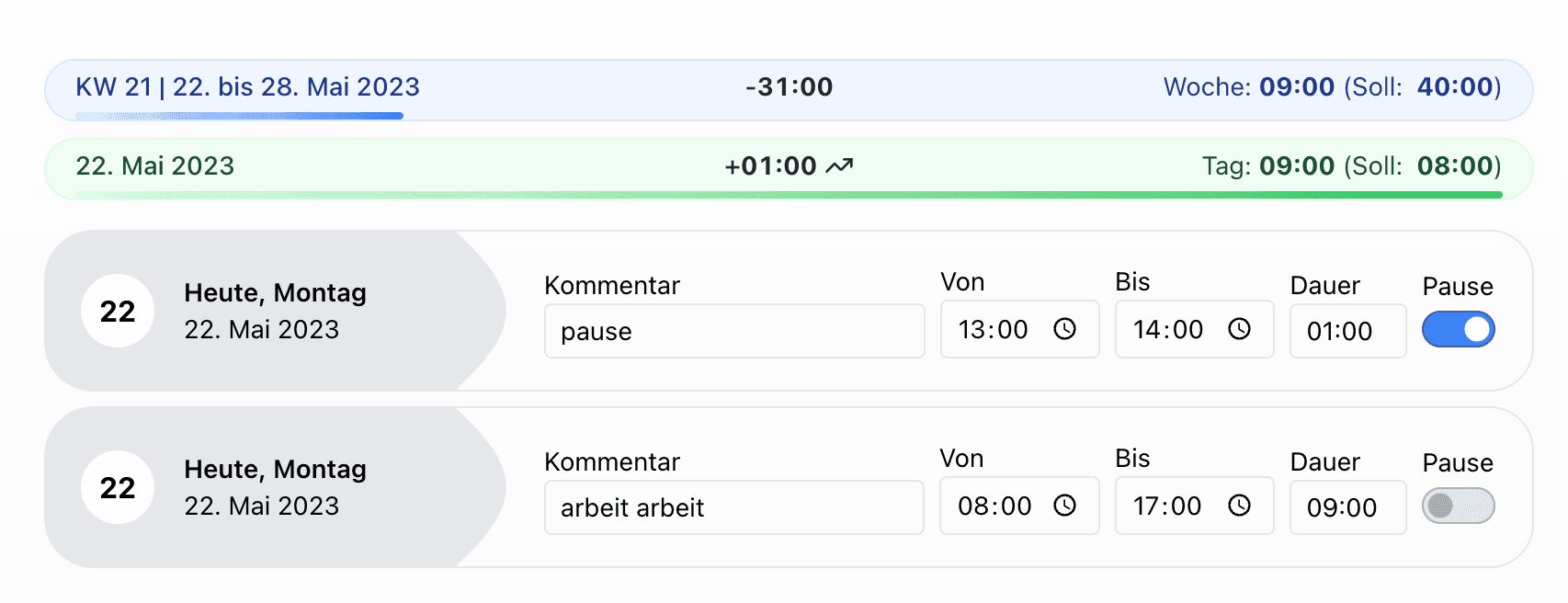 Diese Methode war einfach, entsprach jedoch nicht den arbeitsrechtlichen Vorgaben, nach denen Arbeit und Pause nicht gleichzeitig stattfinden dürfen. Der bisher korrekte Weg war, drei Zeiteinträge zu erstellen: Arbeitszeit vor der Pause, Pausenzeit und Arbeitszeit nach der Pause.